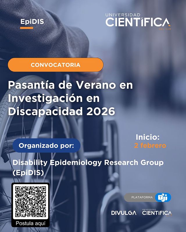 El Grupo de Investigación en Epidemiología de la Discapacidad (EpiDIS) convoca a estudiantes de ciencias de la salud de la Universidad Cientifica del Sur a postular a la Pasantía de Verano en Investigación en Discapacidad 2026, orientada a fortalecer capacidades en investigación aplicada en discapacidad, inequidades en salud y acceso a servicios sanitarios.