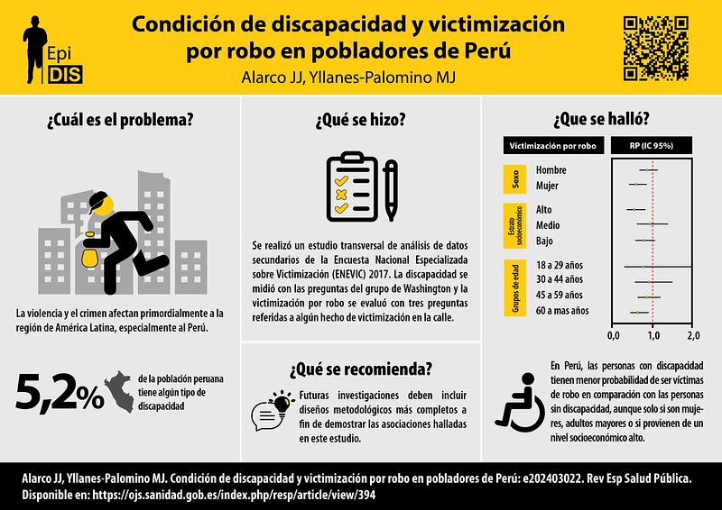 Alarco, J. J., & Yllanes-Palomino, M. J. (2024). Disability status and robbery victimization in Peruvian villagers. Revista Española De Salud Publica.